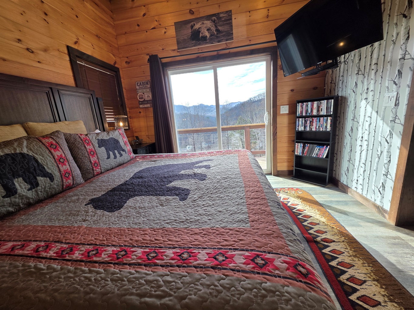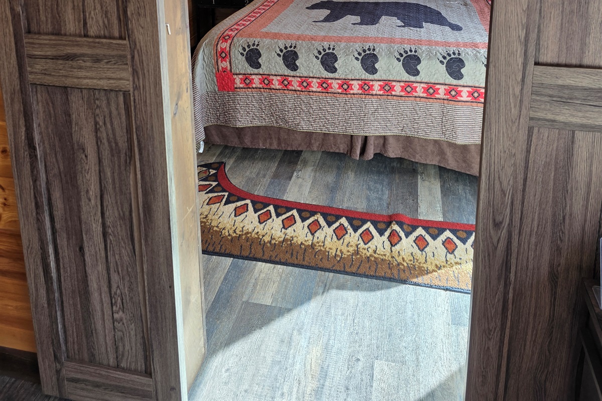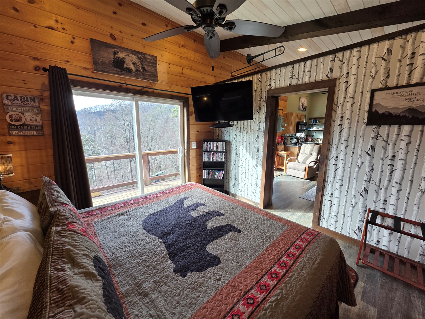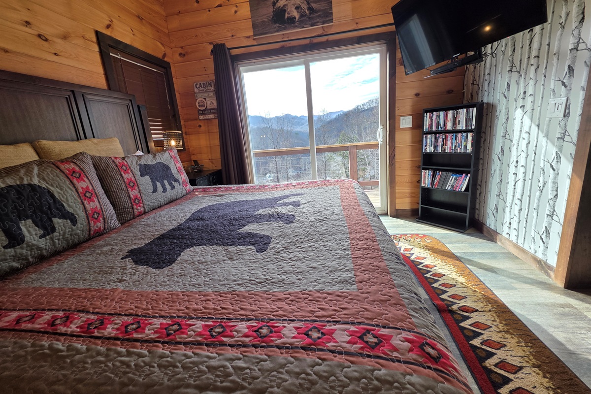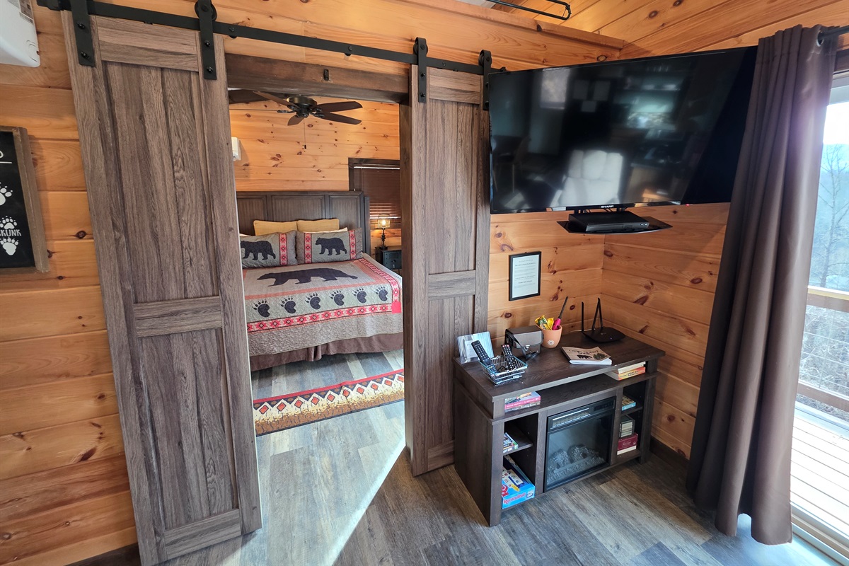 Master Bedroom: Sleep soundly in a king-size bed with comfortable linens and plush pillows. The bedroom also features locking sliding barn doors for privacy, a large screen SMART TV with Blu-ray DVD player, and sliding glass doors that open to the front porch with fantastic views.