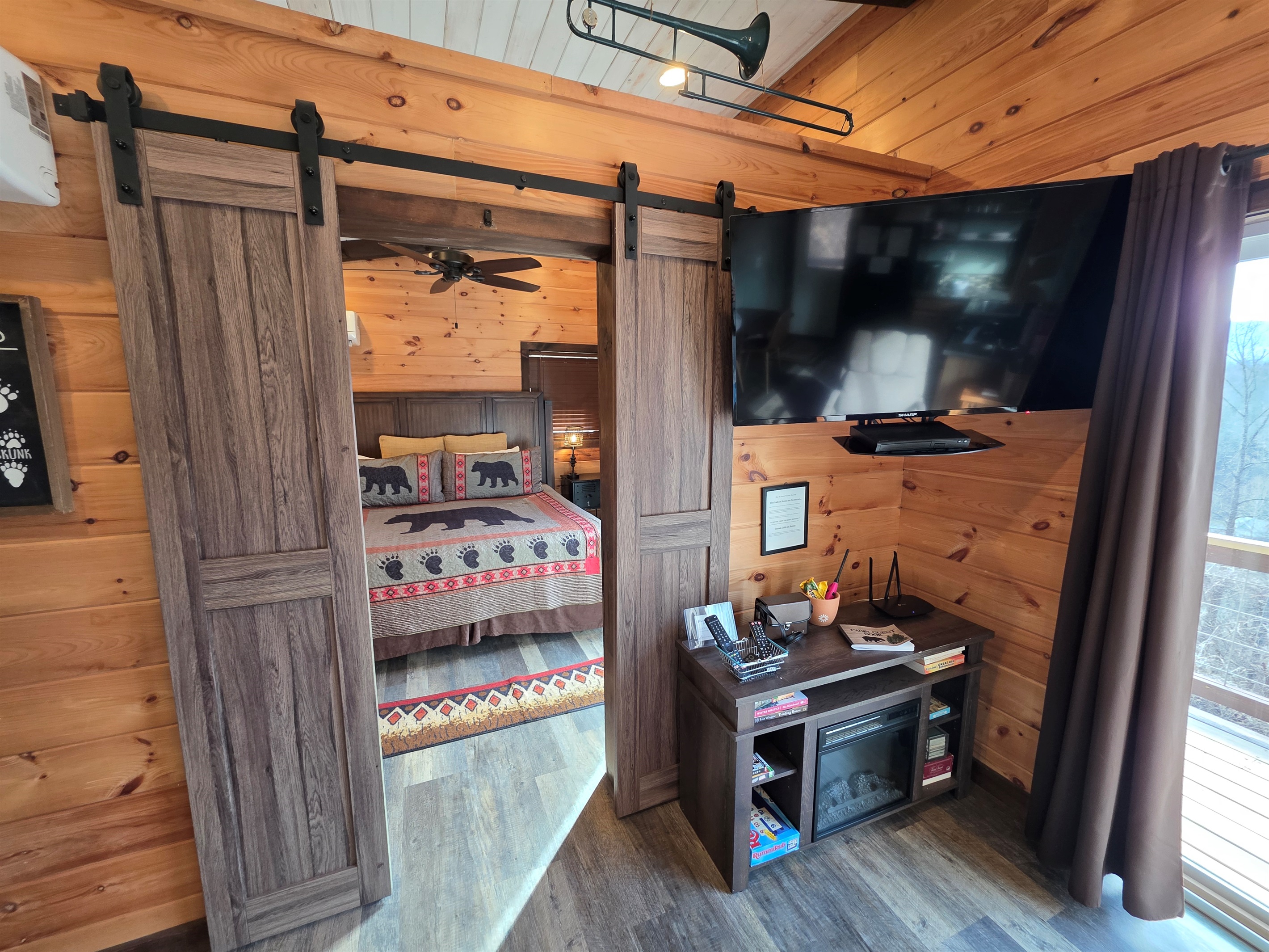 Living Room: The cozy living area offers a comfortable loveseat, a large screen SMART TV, and a DVD player. The queen-size Murphy bed (with a real mattress—no uncomfortable bars) provides additional sleeping space, with linens provided. Sliding glass doors lead to the porch, and the electric fireplace adds warmth and ambiance (for atmosphere rather than primary heating).